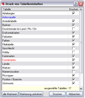 Sie haben hier die Möglichkeit, zu entscheiden, welche Tabellen Sie ausdrucken wollen. Bei Tabellenbezeichnungen, die in blauer Schrift dargestellt sind, ist aus programmtechnischen Gründen kein Ausdrucken möglich.